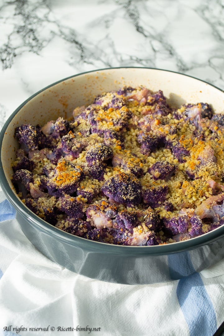 Ho cotto il cavolfiore al vapore utilizzando il Varoma, in modo da mantenerne tutte le proprietà, se utilizzate come me quello viola, non spaventatevi se vi ritroverete l’acqua verde o blu, è del tutto normale.