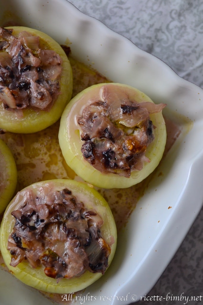 - Disporre le cipolle in una pirofila oliata, farcirle con il composto ottenuto e irrorarle con un filo d'olio.