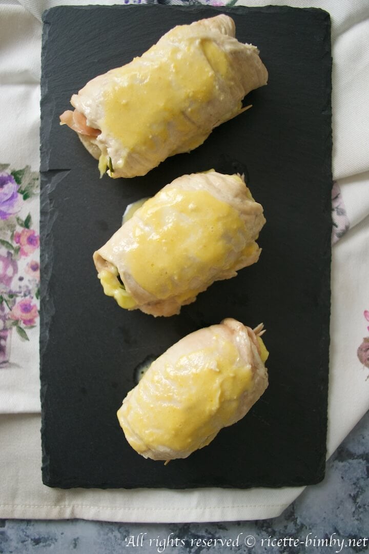 - Prendere le fette di tacchino e batterle con il batticarne, distribuire su ogni fetta un po' di spinaci, una fetta di prosciutto cotto e una di formaggio, salare e pepare, arrotolare formando degli involtini e fermarli con gli stuzzicadenti.