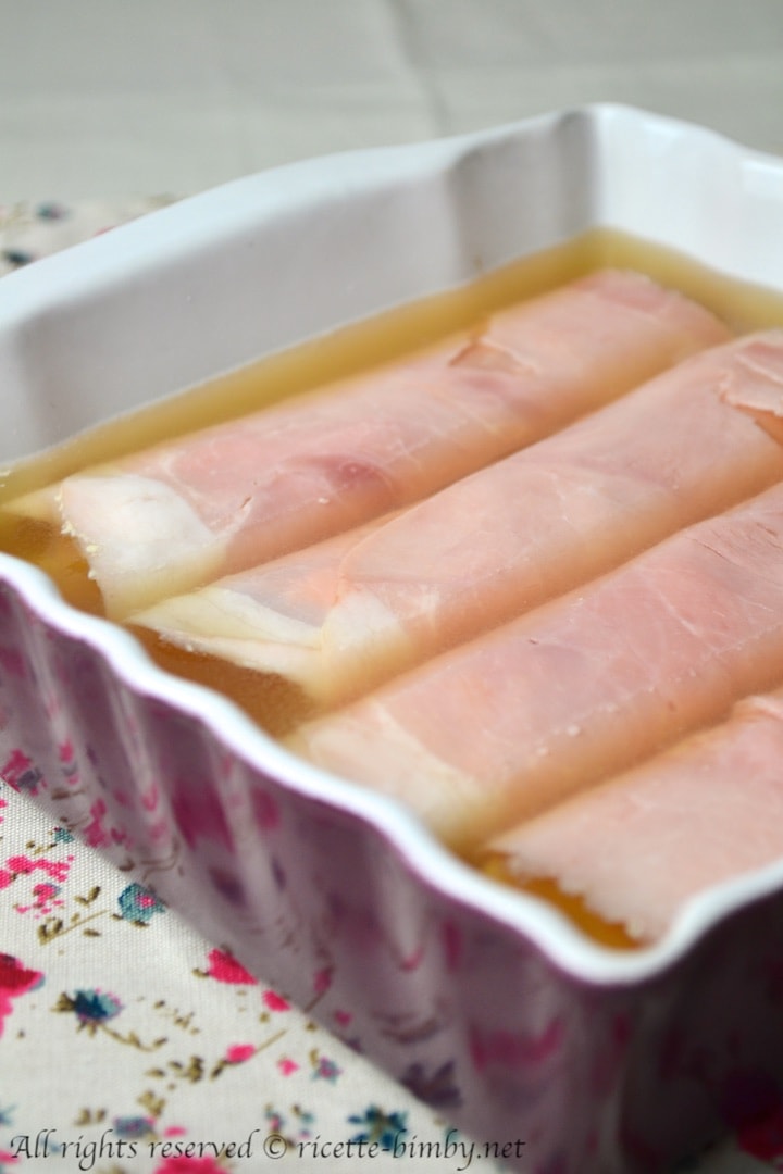 • A questo punto quando la gelatina sarà abbastanza tiepida versarla all’interno della pirofila e lasciare in frigo per una notte a rassodare.