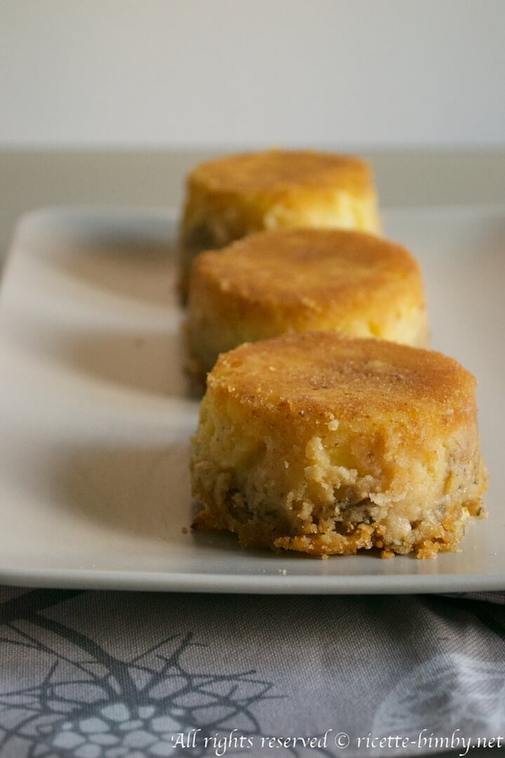 - Imburrare e spolverare con del pangrattato 4 stampini, versare uno strato di purè, riempire con qualche cucchiaiata del composto di funghi e finire con un altro strato di purè, proseguire con gli altri stampini.