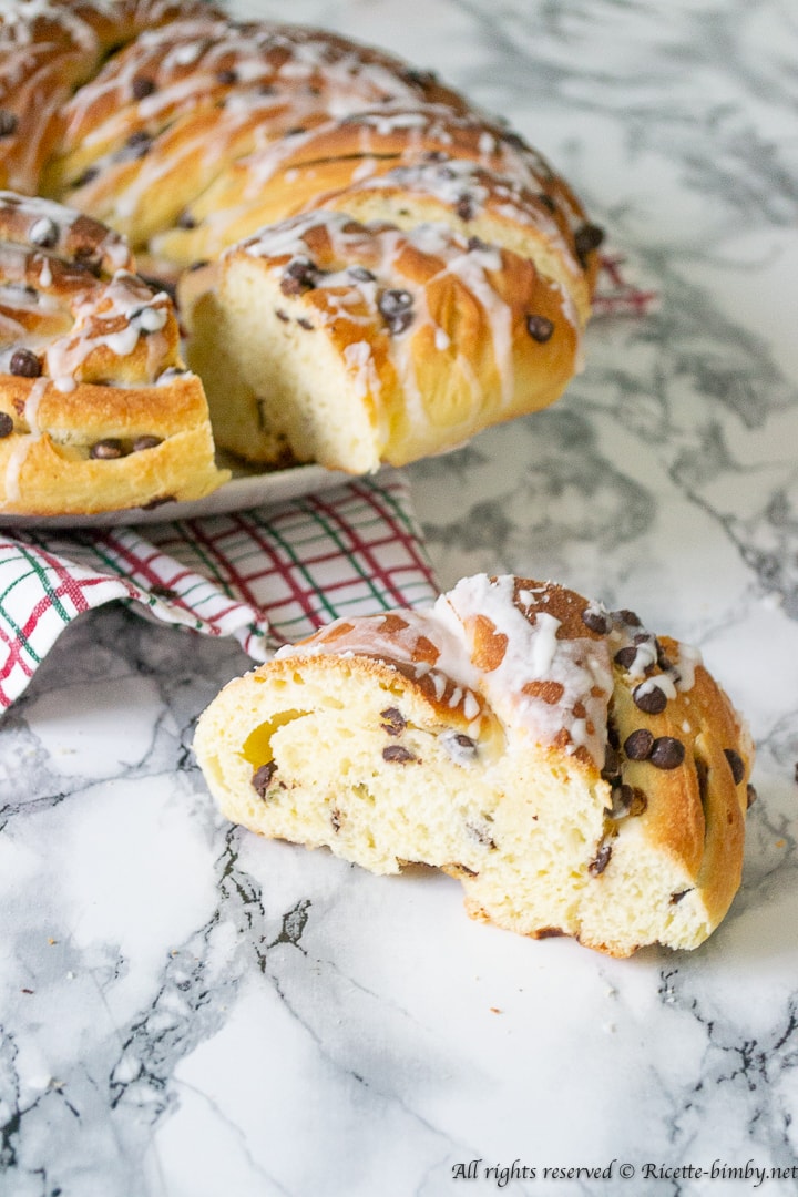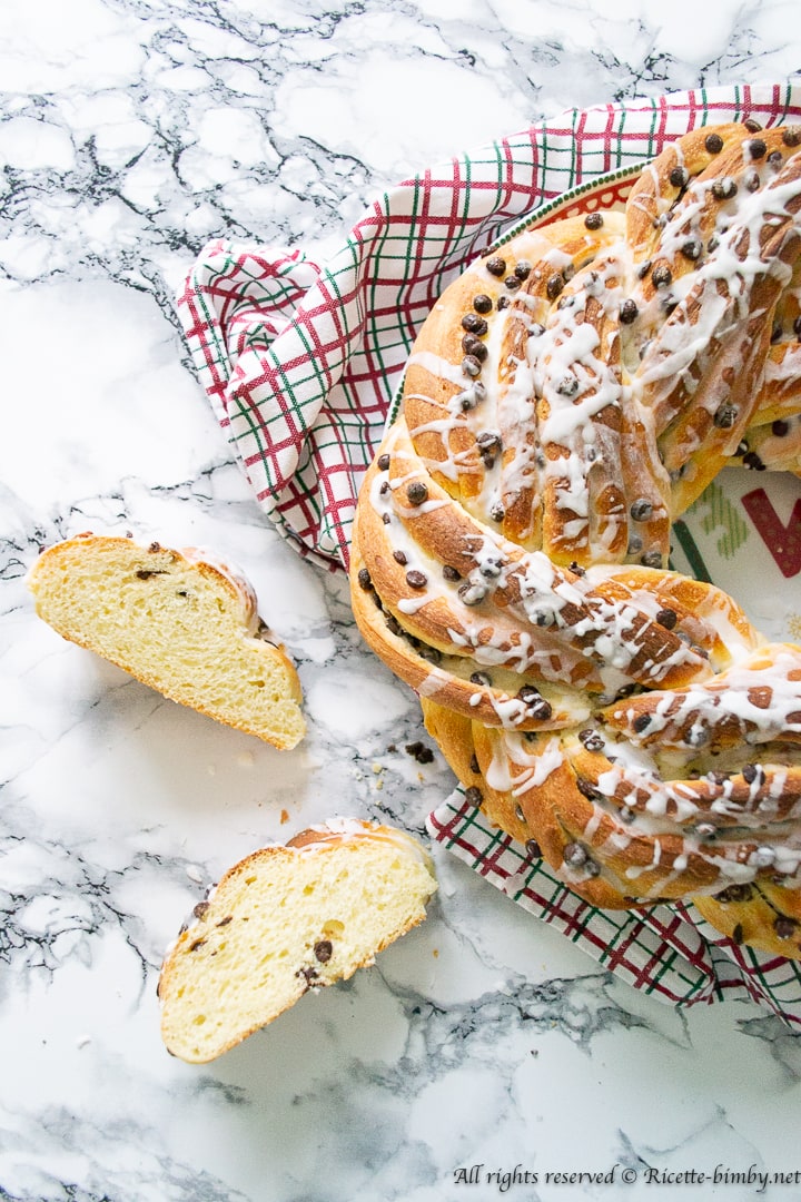 È un lievitato dalla consistenza morbida, spesso ha come ripieno gocce di cioccolato o uvetta e arancia candita e ha una caratteristica forma a ciambella. Ideale da servire nei giorni di festa, ma secondo me perfetta anche da regalare per Natale, chiusa magari in un sacchetto da panettone e decorata con un bel fiocco rosso.
