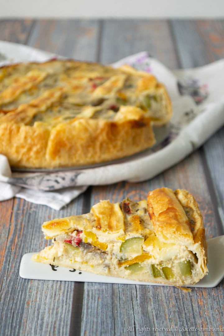 La ricetta bimby per preparare un torta salata con melanzane, zucchine e peperoni.