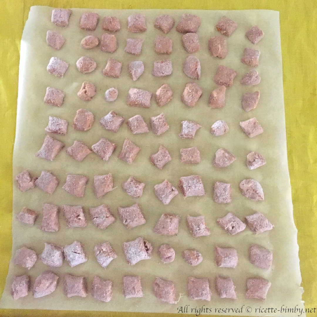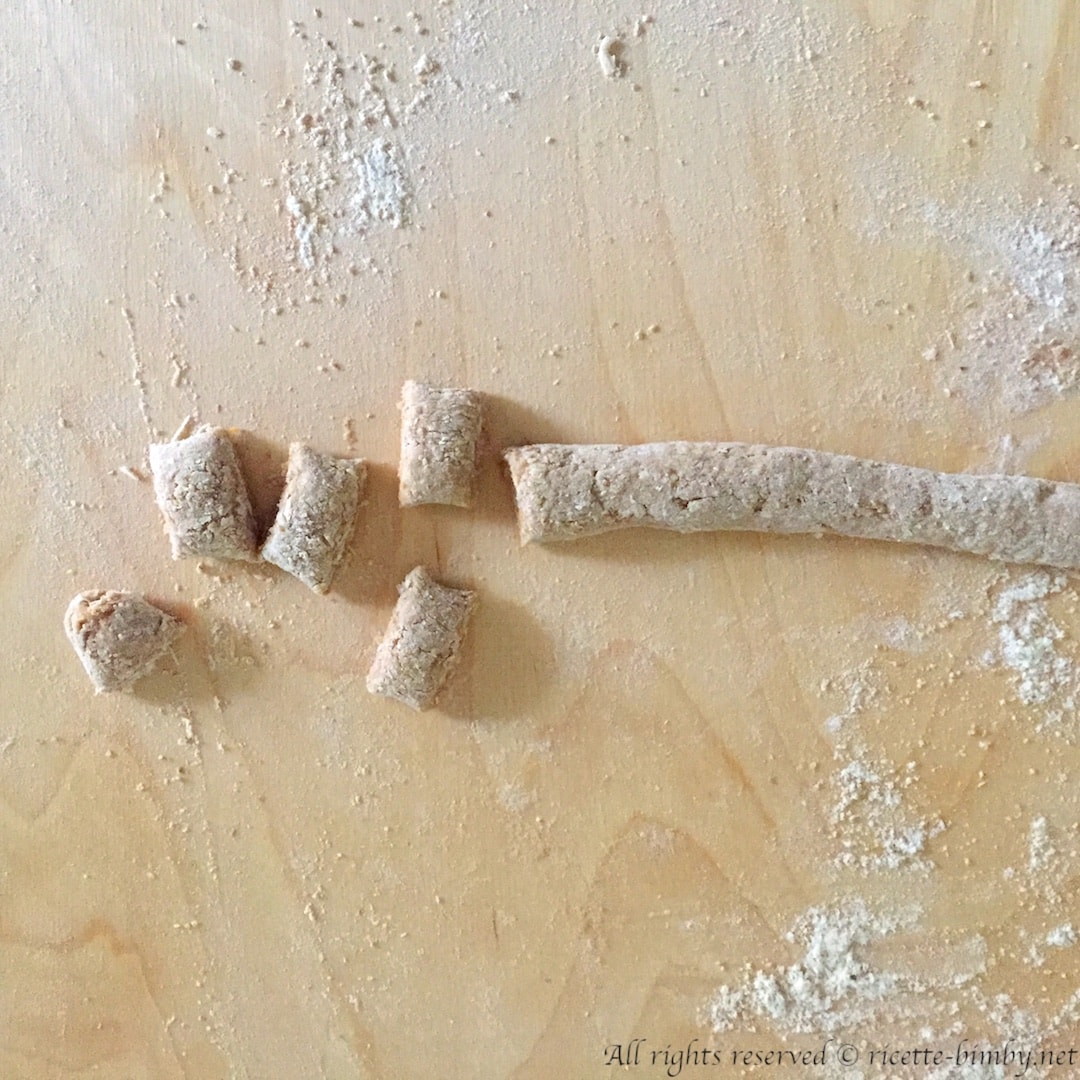 Su un piano da lavoro infarinato formare tanti cordoncini di 1 cm di diametro e tagliarli a tocchi di 2 cm.