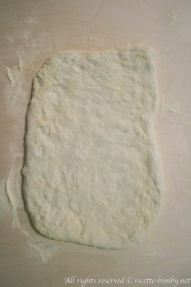 Riprendere successivamente l'impasto, su un ripiano da lavoro spolverizzato di farina di grano duro stendere l'impasto in un rettangolo.