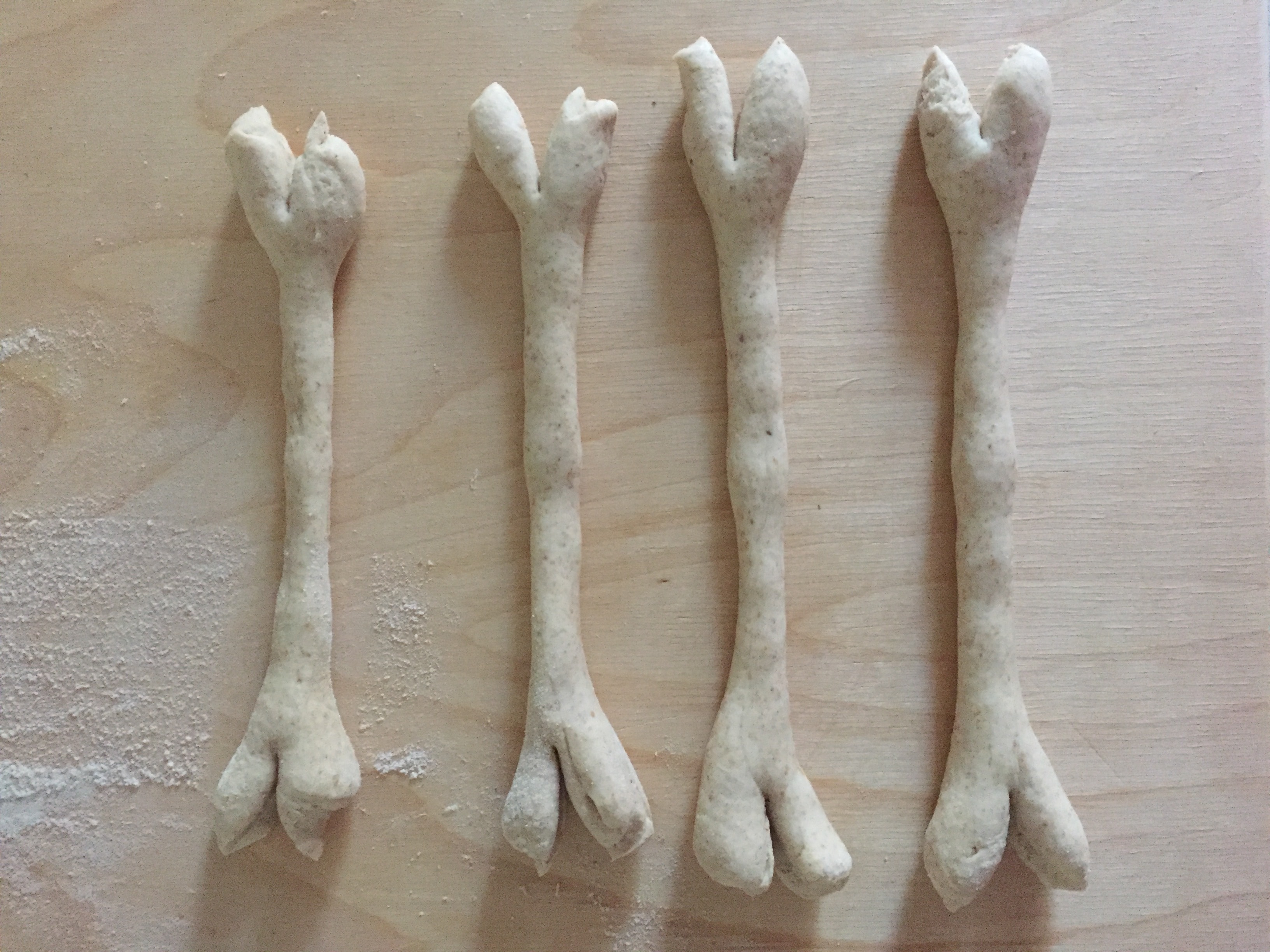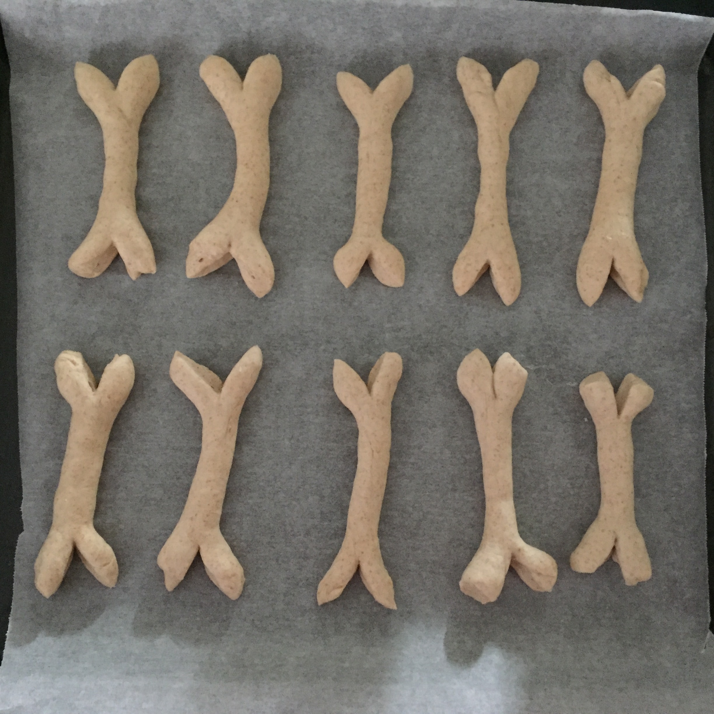• Riporre le ossa d'impasto ottenute su una teglia rivestita di carta forno e lasciarle lievitare coperti per altri 40 minuti circa.