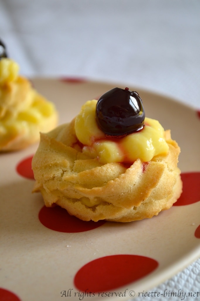 Per farcirle ho usato la crema bimby senza glutine, praticamente è identica a quella pubblicata qui, con l’unica differenza di aver sostituito la farina 00 con quella senza glutine. 😉